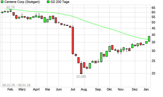 Mit dem Anstieg auf 37,95 EUR hat die Centene-Aktie am 05.01.2026 die 200-Tage-Linie nach oben gekreuzt.Die Centene-Aktie befand sich seit dem 20.09.2024 im langfristigen Aufwärtstrend ...weiterlesen