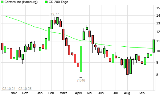 Mit dem Anstieg auf 11,00 EUR hat die Certara-Aktie am 01.10.2025 die 200-Tage-Linie nach oben gekreuzt.Die Certara-Aktie befand sich seit dem 14.05.2025 im langfristigen Abwärtstrend und hat ...weiterlesen