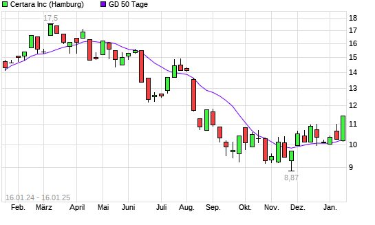 Mit dem Anstieg auf 11,35 EUR hat die Certara-Aktie am 15.01.2025 die 50-Tage-Linie nach oben gekreuzt.Die Certara-Aktie befindet sich seit dem 24.07.2024 im langfristigen Abwärtstrend und hat ...weiterlesen