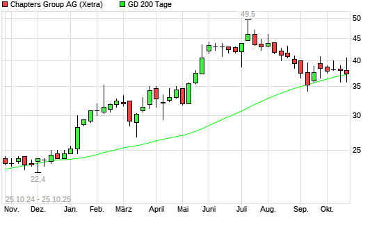 Mit dem Anstieg auf 39,00 EUR hat die Chapters Group-Aktie am 24.10.2025 die 200-Tage-Linie nach oben gekreuzt.Die Chapters Group-Aktie befand sich seit dem 22.10.2025 im langfristigen Abwärtstrend ...weiterlesen
