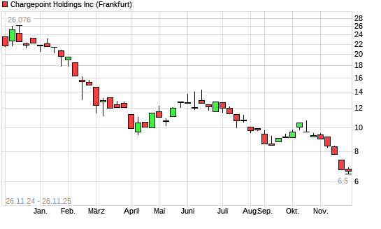 Mit dem Rücksetzer auf 6,50 EUR hat die ChargePoint Holdings-Aktie (ISIN US15961R3030) am 25.11.2025 ein neues All-Time-Low erreicht und damit den Kurs vom 21.11.2025 eingestellt.Der Abstand ...weiterlesen