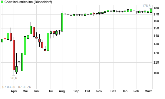 Mit dem Anstieg auf 176,80 EUR hat die Chart Industries-Aktie (ISIN US16115Q3083) am 06.03.2026 ein neues 12-Monats-Hoch erreicht und damit den Kurs vom 20.11.2025 eingestellt.Die ...weiterlesen