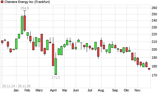 Mit dem Rücksetzer auf 175,80 EUR hat die Cheniere Energy-Aktie (ISIN US16411R2085) am 24.11.2025 ein neues 12-Monats-Tief erreicht und damit den Kurs vom 05.11.2025 eingestellt.Die Cheniere ...weiterlesen
