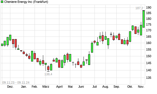 Mit dem Anstieg auf 187,20 EUR hat die Cheniere Energy-Aktie (ISIN US16411R2085) am 08.11.2024 ein neues All-Time-High erreicht und damit den Kurs vom 07.11.2024 eingestellt.Die Cheniere Energy-Aktie ...weiterlesen