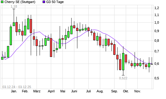 Mit dem Rücksetzer auf 0,60 EUR hat die Cherry-Aktie am 02.12.2025 die 50-Tage-Linie nach unten gekreuzt.Die Cherry-Aktie befindet sich seit dem 10.09.2025 im langfristigen Abwärtstrend ...weiterlesen