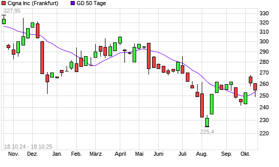 Mit dem Anstieg auf 254,65 EUR hat die Cigna-Aktie am 17.10.2025 die 50-Tage-Linie nach oben gekreuzt.Die Cigna-Aktie befindet sich seit dem 13.05.2025 im langfristigen Abwärtstrend und hat ...weiterlesen