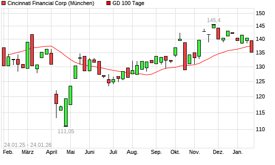 Mit dem Rücksetzer auf 134,60 EUR hat die Cincinnati Financial-Aktie am 23.01.2026 die 100-Tage-Linie nach unten gekreuzt.Die Cincinnati Financial-Aktie befindet sich seit dem 20.10.2025 ...weiterlesen
