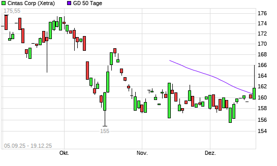 Mit dem Anstieg auf 163,15 EUR hat die Cintas-Aktie am 18.12.2025 die 50-Tage-Linie nach oben gekreuzt.Die Cintas-Aktie befindet sich seit dem 15.08.2025 im langfristigen Abwärtstrend und hat ...weiterlesen