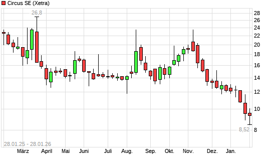 Mit dem Rücksetzer auf 8,56 EUR hat die Circus-Aktie (ISIN DE000A2YN355) am 27.01.2026 ein neues 12-Monats-Tief erreicht und damit den Kurs vom 26.01.2026 eingestellt.Die Circus-Aktie befindet ...weiterlesen