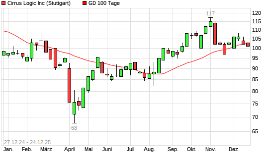 Mit dem Rücksetzer auf 101,00 EUR hat die Cirrus Logic-Aktie am 23.12.2025 die 100-Tage-Linie nach unten gekreuzt.Die Cirrus Logic-Aktie befindet sich seit dem 14.08.2025 im langfristigen ...weiterlesen