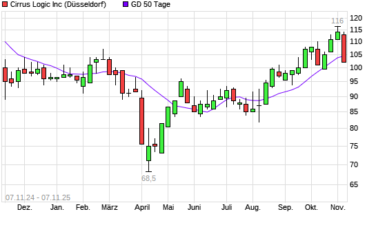 Mit dem Rücksetzer auf 103,00 EUR hat die Cirrus Logic-Aktie am 06.11.2025 die 50-Tage-Linie nach unten gekreuzt.Die Cirrus Logic-Aktie befindet sich seit dem 14.08.2025 im langfristigen ...weiterlesen