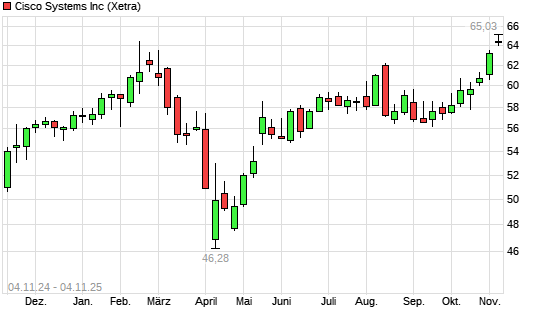 Mit dem Anstieg auf 64,58 EUR hat die Cisco-Aktie (ISIN US17275R1023) am 03.11.2025 ein neues 10-Jahres-Hoch erreicht und damit den Kurs vom 31.10.2025 eingestellt.Die Cisco-Aktie befindet sich ...weiterlesen