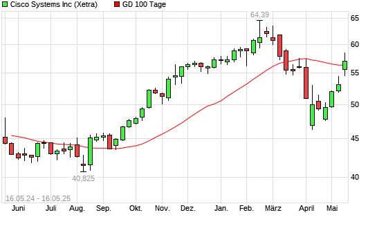 Mit dem Anstieg auf 57,58 EUR hat die Cisco-Aktie am 15.05.2025 die 100-Tage-Linie nach oben gekreuzt.Die Cisco-Aktie befindet sich seit dem 08.05.2025 im langfristigen Aufwärtstrend ...weiterlesen