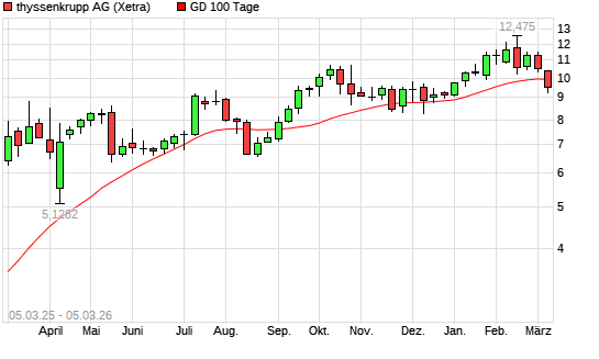 Mit dem Anstieg auf 9,90 EUR hat die ThyssenKrupp-Aktie am 04.03.2026 die 100-Tage-Linie nach oben gekreuzt.Die ThyssenKrupp-Aktie befindet sich seit dem 14.01.2025 im ...weiterlesen