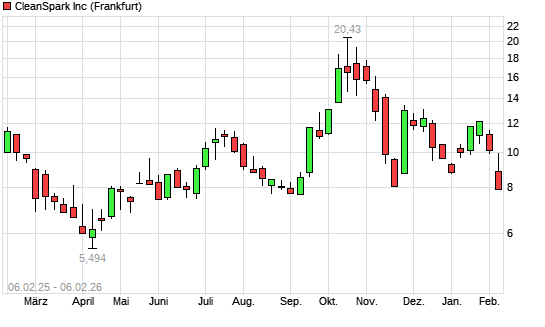 Mit dem Rücksetzer auf 7,03 EUR hat die Cleanspark-Aktie (ISIN US18452B2097) am 05.02.2026 ein neues 6-Monats-Tief erreicht und damit den Kurs vom 05.09.2025 eingestellt.Die Cleanspark-Aktie ...weiterlesen