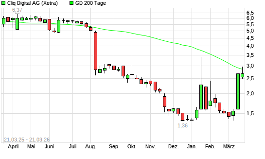 Mit dem Rücksetzer auf 2,56 EUR hat die Cliq Digital-Aktie am 20.03.2026 die 200-Tage-Linie nach unten gekreuzt.Die Cliq Digital-Aktie befand sich seit dem 18.03.2026 im ...weiterlesen