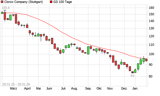 Mit dem Rücksetzer auf 94,50 EUR hat die Clorox-Aktie am 27.01.2026 die 100-Tage-Linie nach unten gekreuzt.Die Clorox-Aktie befindet sich seit dem 05.03.2025 im langfristigen Abwärtstrend ...weiterlesen