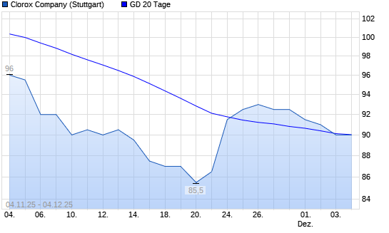 Mit dem Rücksetzer auf 90,00 EUR hat die Clorox-Aktie am 03.12.2025 die 20-Tage-Linie nach unten gekreuzt.Die Clorox-Aktie befindet sich seit dem 05.03.2025 im langfristigen Abwärtstrend ...weiterlesen