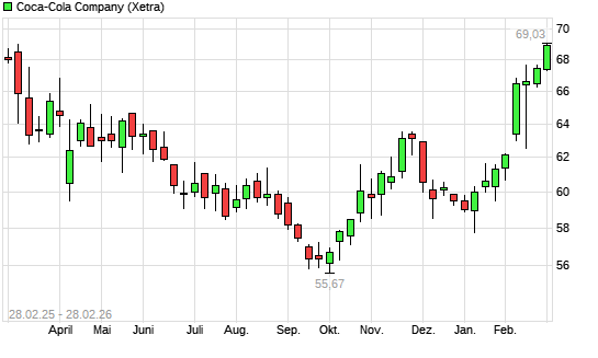 Mit dem Anstieg auf 69,00 EUR hat die Coca-Cola-Aktie (ISIN US1912161007) am 27.02.2026 ein neues 6-Monats-Hoch erreicht und damit den Kurs vom 23.02.2026 eingestellt.Die ...weiterlesen