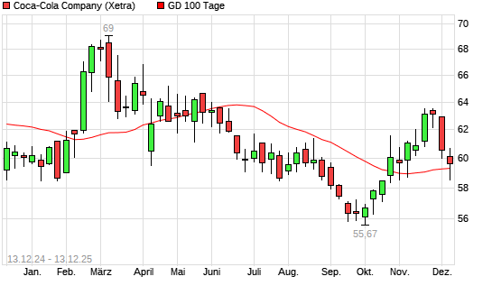 Mit dem Anstieg auf 60,08 EUR hat die Coca-Cola-Aktie am 12.12.2025 die 100-Tage-Linie nach oben gekreuzt.Die Coca-Cola-Aktie befindet sich seit dem 02.12.2025 im langfristigen Abwärtstrend ...weiterlesen