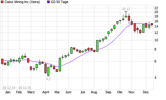 Mit dem Anstieg auf 14,63 EUR hat die Coeur Mining-Aktie am 17.12.2025 die 50-Tage-Linie nach oben gekreuzt.Die Coeur Mining-Aktie befindet sich seit dem 08.05.2025 im langfristigen Aufwärtstrend ...weiterlesen
