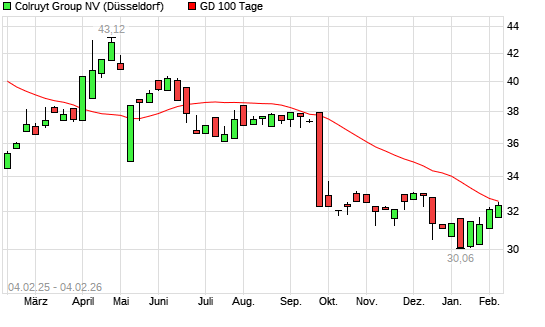 Mit dem Anstieg auf 32,34 EUR hat die Colruyt-Aktie am 03.02.2026 die 100-Tage-Linie nach oben gekreuzt.Die Colruyt-Aktie befindet sich seit dem 11.09.2025 im langfristigen Abwärtstrend und ...weiterlesen