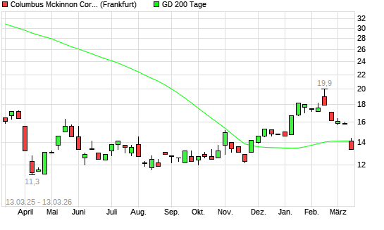 Mit dem Rücksetzer auf 13,90 EUR hat die Columbus McKinnon-Aktie am 12.03.2026 die 200-Tage-Linie nach unten gekreuzt.Die Columbus McKinnon-Aktie befand sich seit dem 10.03.2026 ...weiterlesen