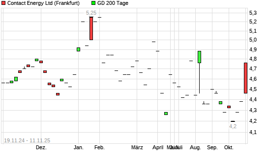 Mit dem Rücksetzer auf 4,68 EUR hat die Contact Energy-Aktie am 18.11.2025 die 200-Tage-Linie nach unten gekreuzt.Die Contact Energy-Aktie befand sich seit dem 13.11.2025 im langfristigen ...weiterlesen