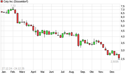 Mit dem Rücksetzer auf 2,50 EUR hat die Coty-Aktie (ISIN US2220702037) am 23.12.2025 ein neues 5-Jahres-Tief erreicht und damit den Kurs vom 22.12.2025 eingestellt.Die Coty-Aktie befindet ...weiterlesen