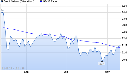 Mit dem Anstieg auf 21,80 EUR hat die Credit Saison-Aktie am 11.11.2025 die 38-Tage-Linie nach oben gekreuzt.Die Credit Saison-Aktie befindet sich seit dem 01.10.2025 im langfristigen Abwärtstrend ...weiterlesen
