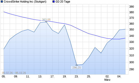 Mit dem Anstieg auf 338,90 EUR hat die CrowdStrike-Aktie am 04.03.2026 die 20-Tage-Linie nach oben gekreuzt.Die CrowdStrike-Aktie befindet sich seit dem 12.01.2026 im ...weiterlesen