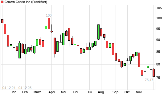 Mit dem Rücksetzer auf 75,56 EUR hat die Crown Castle International-Aktie (ISIN US22822V1017) am 03.12.2025 ein neues 5-Jahres-Tief erreicht und damit den Kurs vom 07.11.2025 eingestellt.Die ...weiterlesen