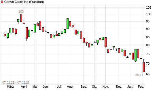 Mit dem Rücksetzer auf 66,11 EUR hat die Crown Castle International-Aktie (ISIN US22822V1017) am 06.02.2026 ein neues 10-Jahres-Tief erreicht und damit den Kurs vom 05.02.2026 eingestellt.Die ...weiterlesen