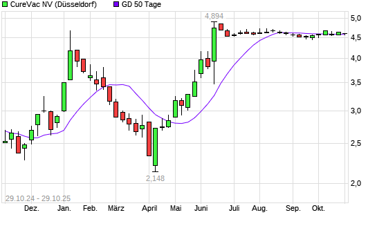 Mit dem Rücksetzer auf 4,57 EUR hat die CureVac-Aktie am 28.10.2025 die 50-Tage-Linie nach unten gekreuzt.Die CureVac-Aktie befindet sich seit dem 28.04.2025 im ...weiterlesen