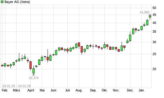Mit dem Anstieg auf 44,55 EUR hat die Bayer-Aktie (ISIN DE000BAY0017) am 23.01.2026 ein neues 12-Monats-Hoch erreicht und damit den Kurs vom 19.01.2026 eingestellt.Die Bayer-Aktie befindet sich ...weiterlesen