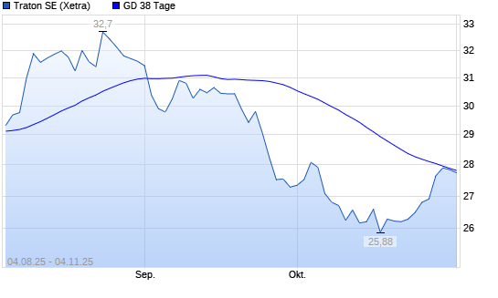 Mit dem Anstieg auf 27,94 EUR hat die Traton-Aktie am 03.11.2025 die 38-Tage-Linie nach oben gekreuzt.Die Traton-Aktie befindet sich seit dem 22.09.2025 im langfristigen Abwärtstrend und hat ...weiterlesen