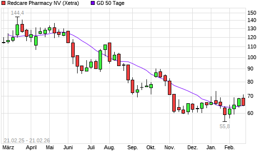 Mit dem Rücksetzer auf 64,35 EUR hat die Redcare Pharmacy (ex Shop Apotheke)-Aktie am 20.02.2026 die 50-Tage-Linie nach unten gekreuzt.Die Redcare Pharmacy (ex Shop ...weiterlesen