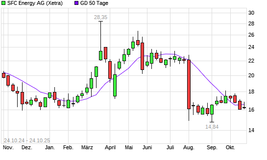 Mit dem Rücksetzer auf 16,10 EUR hat die SFC Energy-Aktie am 23.10.2025 die 50-Tage-Linie nach unten gekreuzt.Die SFC Energy-Aktie befindet sich seit dem 31.07.2025 im langfristigen Abwärtstrend ...weiterlesen