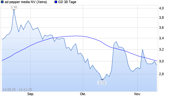 Mit dem Rücksetzer auf 2,94 EUR hat die Ad Pepper Media-Aktie am 13.11.2025 die 38-Tage-Linie nach unten gekreuzt.Die Ad Pepper Media-Aktie befindet sich seit dem 03.11.2025 im langfristigen ...weiterlesen