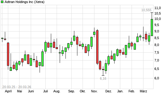 Mit dem Anstieg auf 10,36 EUR hat die Adtran-Aktie (ISIN US00486H1059) am 19.03.2026 ein neues 12-Monats-Hoch erreicht und damit den Kurs vom 18.03.2026 eingestellt.Die ...weiterlesen