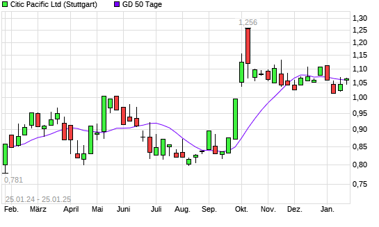 Mit dem Anstieg auf 1,07 EUR hat die Citic Pacific-Aktie am 24.01.2025 die 50-Tage-Linie nach oben gekreuzt.Die Citic Pacific-Aktie befindet sich seit dem 24.09.2024 im langfristigen Aufwärtstrend ...weiterlesen