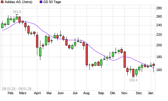 Mit dem Anstieg auf 164,35 EUR hat die Adidas-Aktie am 08.01.2026 die 50-Tage-Linie nach oben gekreuzt.Die Adidas-Aktie befindet sich seit dem 10.03.2025 im langfristigen Abwärtstrend ...weiterlesen
