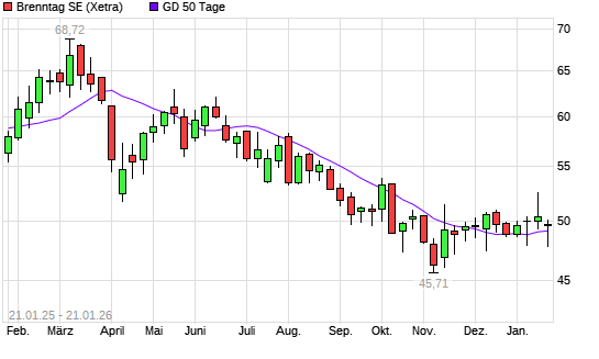 Mit dem Rücksetzer auf 48,00 EUR hat die Brenntag-Aktie am 20.01.2026 die 50-Tage-Linie nach unten gekreuzt.Die Brenntag-Aktie befindet sich seit dem 12.06.2025 im ...weiterlesen