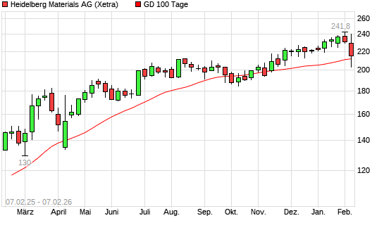 Mit dem Anstieg auf 216,40 EUR hat die Heidelberg Materials-Aktie am 06.02.2026 die 100-Tage-Linie nach oben gekreuzt.Die Heidelberg Materials-Aktie befindet sich seit dem 12.09.2024 im langfristigen ...weiterlesen
