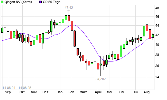 Mit dem Rücksetzer auf 41,27 EUR hat die Qiagen-Aktie am 13.08.2025 die 50-Tage-Linie nach unten gekreuzt.Die Qiagen-Aktie befindet sich seit dem 03.06.2025 im ...weiterlesen