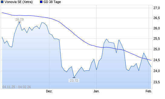 Mit dem Rücksetzer auf 24,12 EUR hat die Vonovia-Aktie am 03.02.2026 die 38-Tage-Linie nach unten gekreuzt.Die Vonovia-Aktie befindet sich seit dem 17.10.2025 im langfristigen Abwärtstrend ...weiterlesen