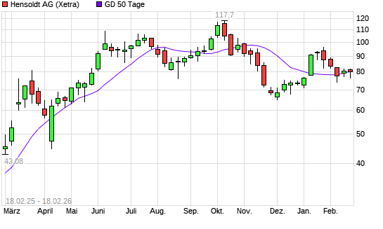 Mit dem Rücksetzer auf 79,35 EUR hat die Hensoldt-Aktie am 17.02.2026 die 50-Tage-Linie nach unten gekreuzt.Die Hensoldt-Aktie befindet sich seit dem 21.01.2026 im ...weiterlesen