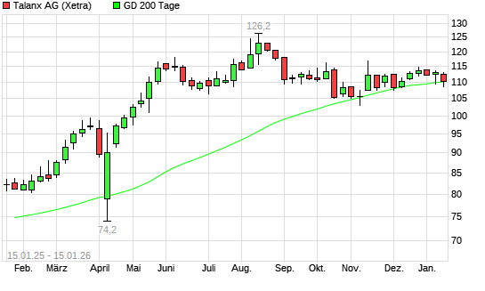 Mit dem Rücksetzer auf 109,40 EUR hat die Talanx-Aktie am 14.01.2026 die 200-Tage-Linie nach unten gekreuzt.Die Talanx-Aktie befand sich seit dem 08.12.2025 im langfristigen Abwärtstrend ...weiterlesen