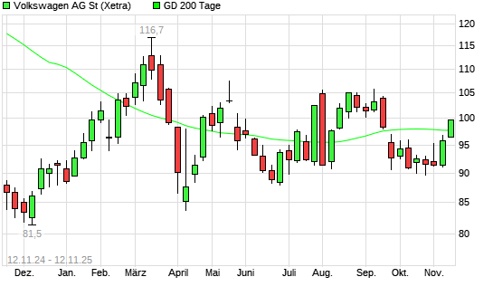Mit dem Anstieg auf 98,75 EUR hat die Volkswagen St-Aktie am 11.11.2025 die 200-Tage-Linie nach oben gekreuzt.Die Volkswagen St-Aktie befand sich seit dem 19.09.2025 im langfristigen Abwärtstrend ...weiterlesen
