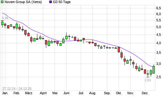 Mit dem Anstieg auf 2,91 EUR hat die Novem Group-Aktie am 23.12.2025 die 50-Tage-Linie nach oben gekreuzt.Die Novem Group-Aktie befindet sich seit dem 20.12.2024 im langfristigen Abwärtstrend ...weiterlesen